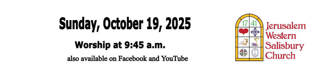 Jerusalem Western Salisbury Church is a congregation which seeks to live out the promise and hope of the Gospel. We aim to be engaged with the world around us, while providing a place of comfort and solace which sustains and enriches the lives of those who gather here. Our mission is to share the love we know from God through Jesus Christ with those we see every week - and those we will never know. We are a congregation which strives, with God's help, to live out the goals of our Vision Statement -- To Welcome All People, Share Christ’s Love for One Another and Help to Make Christ Visible in Daily Life.